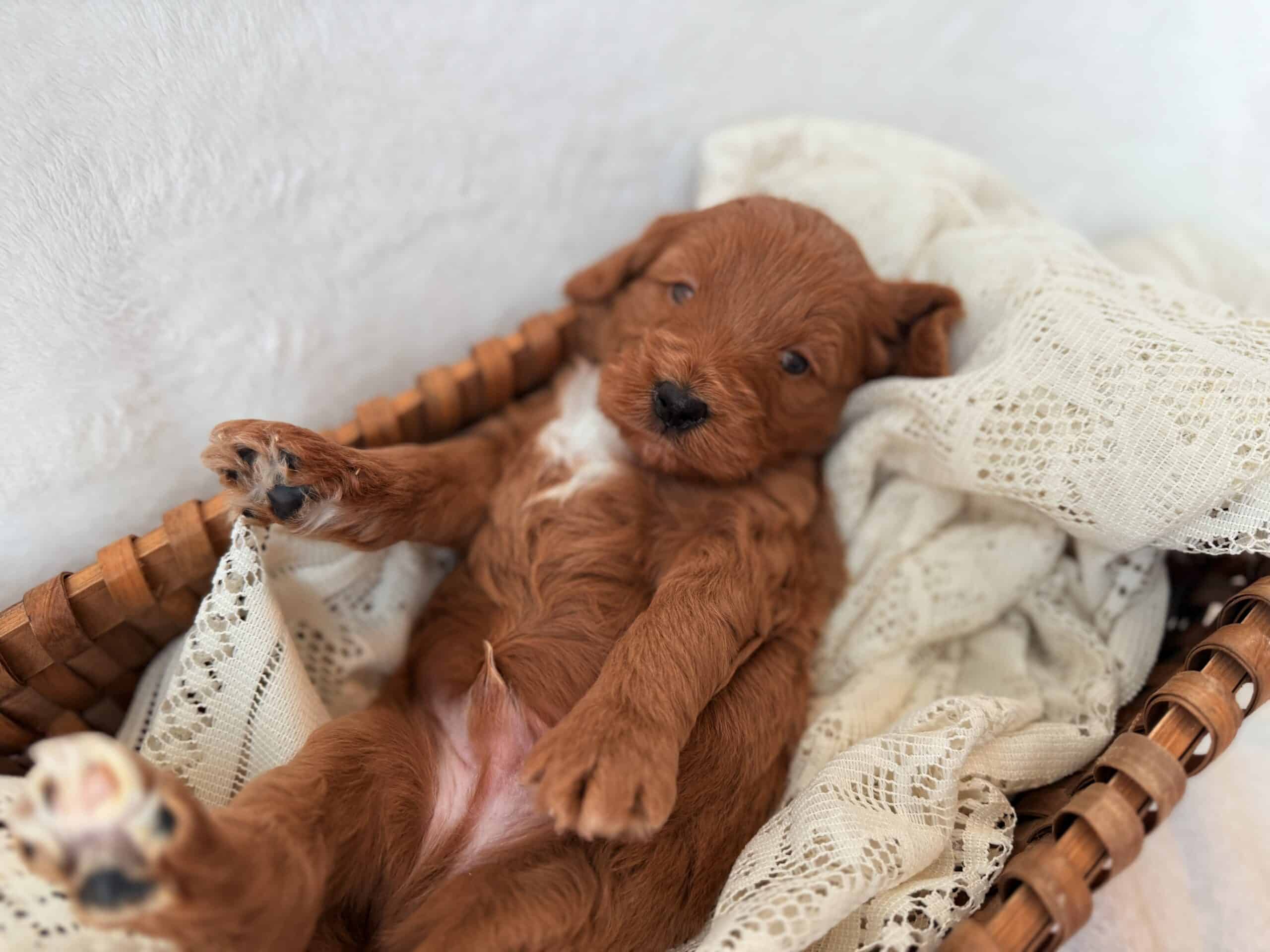 This adorable litter of miniature Goldendoodles was born on February 27th and will mature to 20-30 lbs. They have beautiful straight to wavy coats in various shades of solid red, with some sporting charming red and white markings. These affectionate and intelligent puppies will make loving companions!