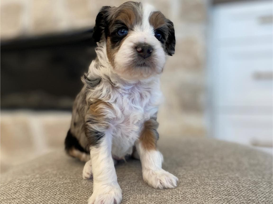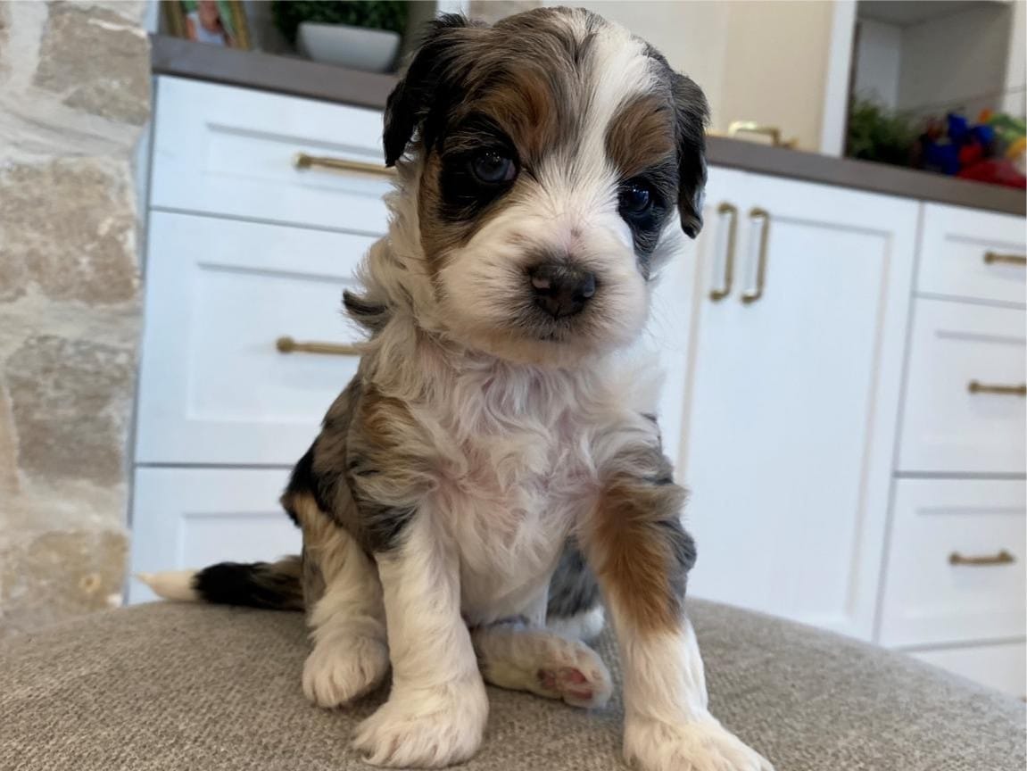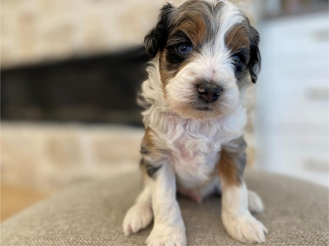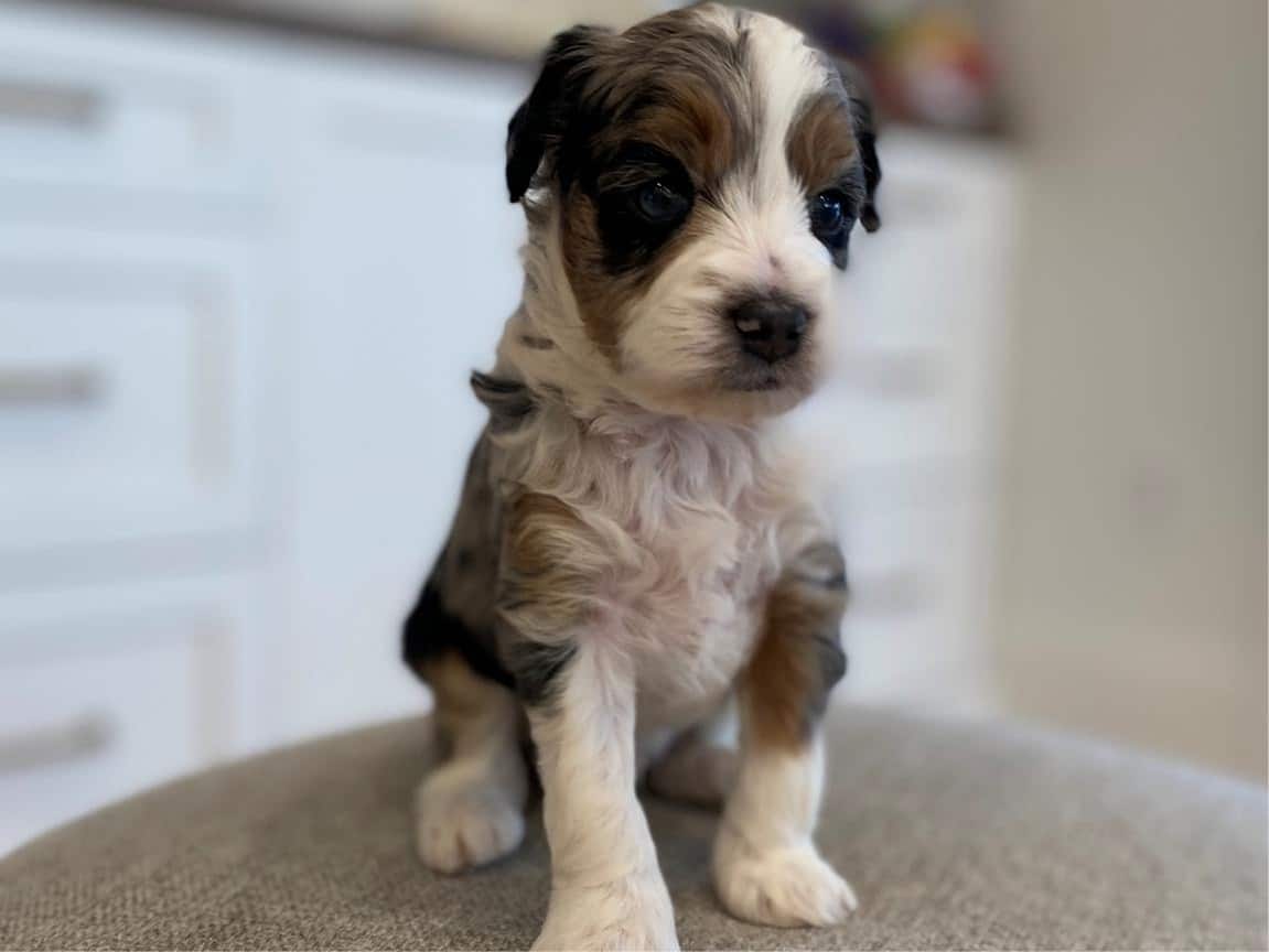 Bernedoodles are known for their hypoallergenic coat, making them an excellent choice for individuals with allergies. Lord Farquaad’s coat is a beautiful Tri-Color Merle, featuring black, brown, and white patches, giving him a truly unique and striking appearance. With proper grooming, Lord Farquaad’s coat will stay looking its best and minimize shedding, making him a perfect fit for those who want a low-maintenance pet.