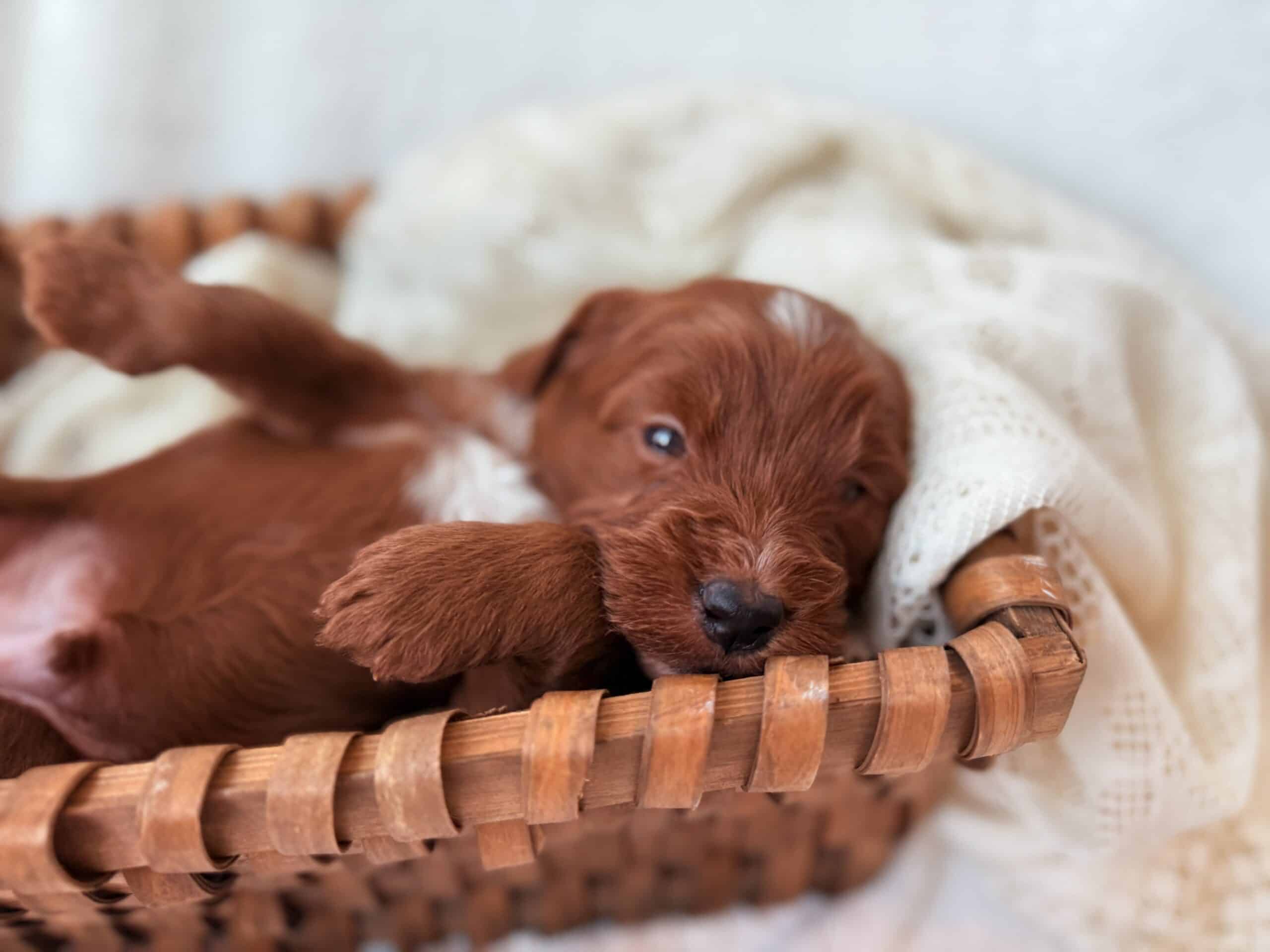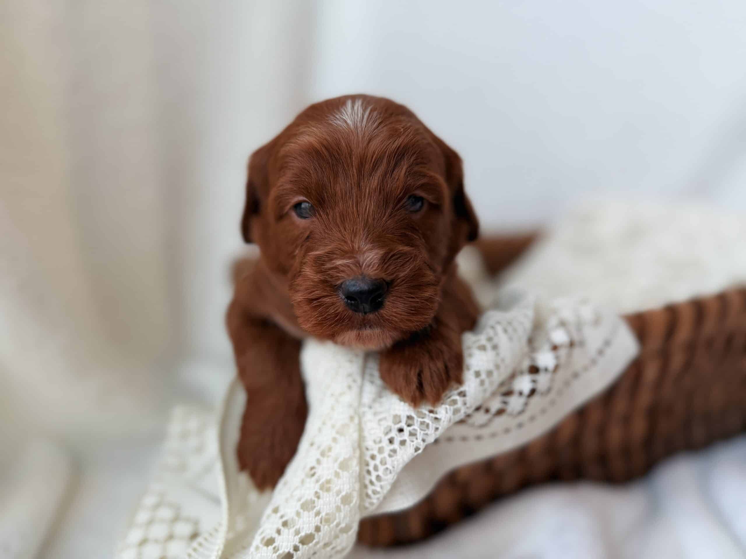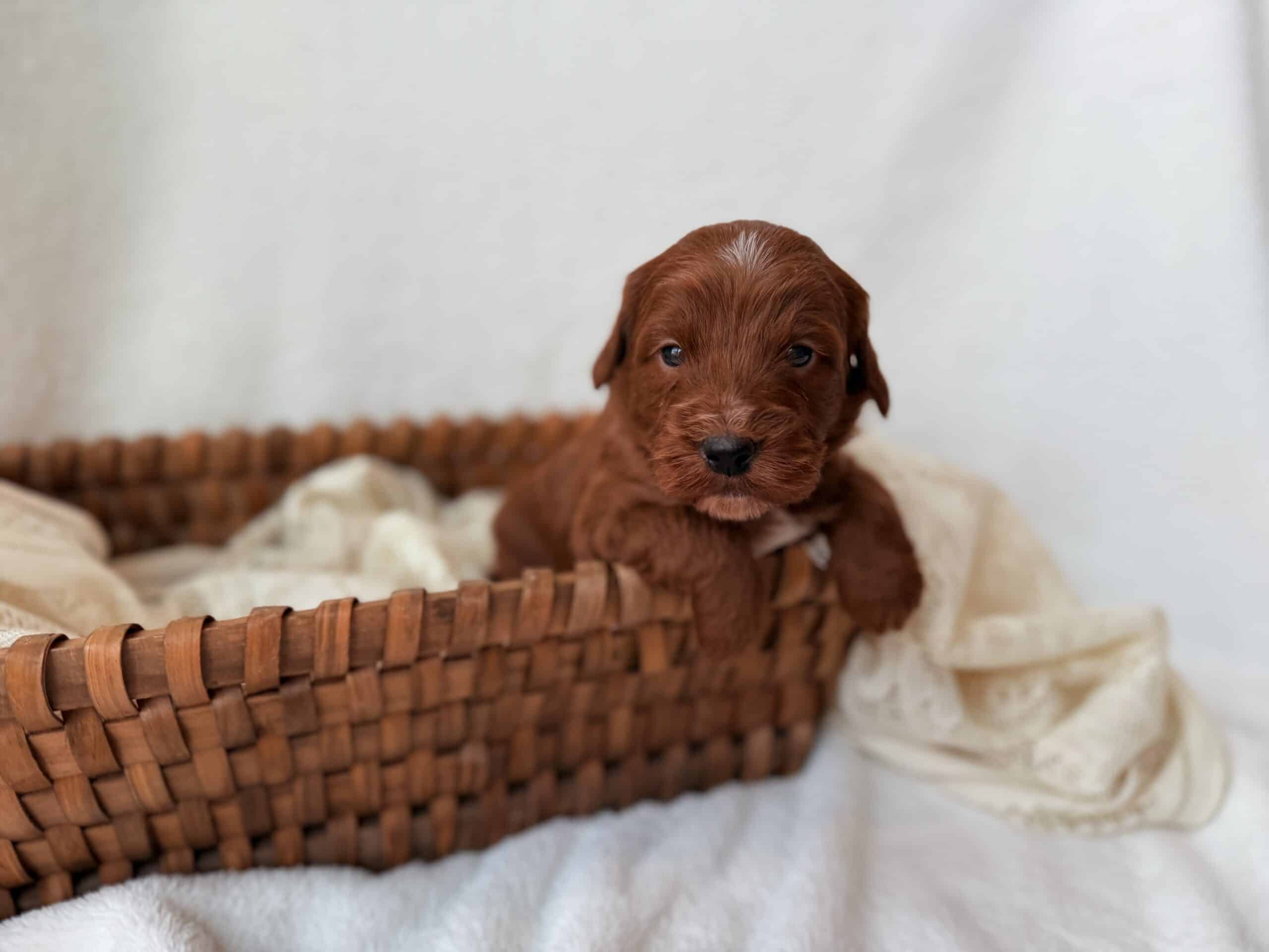 This adorable litter of miniature Goldendoodles was born on February 27th and will mature to 20-30 lbs. They have beautiful straight to wavy coats in various shades of solid red, with some sporting charming red and white markings. These affectionate and intelligent puppies will make loving companions!